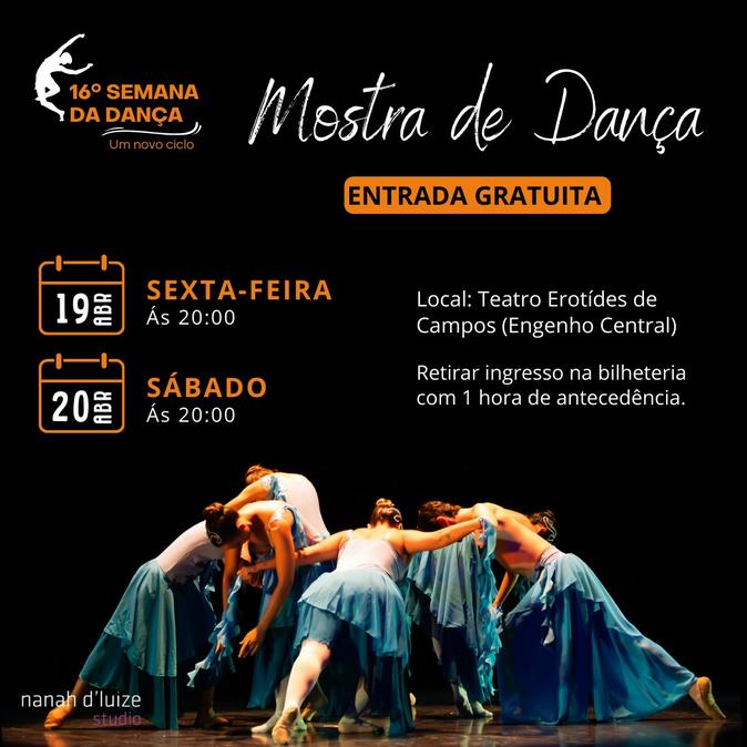 Após série de oficinas, a 16ª Semana da Dança de Piracicaba, realizada pela Adapi (Associação de Dança de Piracicaba), com apoio da Prefeitura de Piracicaba, por meio da Semac (Secretaria Municipal da Ação Cultural), chega na reta final. A Gala de Encerramento terá dois dias de apresentações de escolas e grupos locais, entre amanhã, 19/04, e sábado, 20/04, sempre a partir das 20h, no Teatro Municipal Erotides de Campos, no Parque do Engenho Central. A entrada é gratuita e os ingressos devem ser retirados uma hora antes do início do espetáculo.